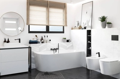 Corsan INTERO freistehende Eckbadewanne SLIM 150 x 75 Linksmontage Klick-Klack-Stöpsel Graphit/GunMetal
